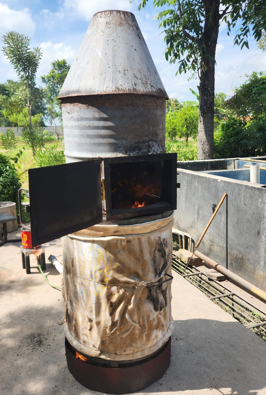 Selanjutnya, dilakukan pembuatan incinerator dengan menggunakan peralatan dan bahan baku yang mudah dijumpai, seperti menggunakan material tong besi, plat besi dan berbagai macam pipa besi. Untuk membakar limbah dapat menggunakan bahan bakar oli bekas ataupun minyak jelantah.