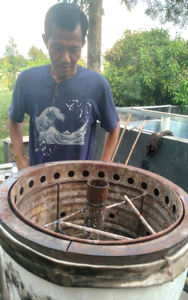 Yudi Kusnandar atau Pak Dewan melihat Incinerator buatannya sendiri.