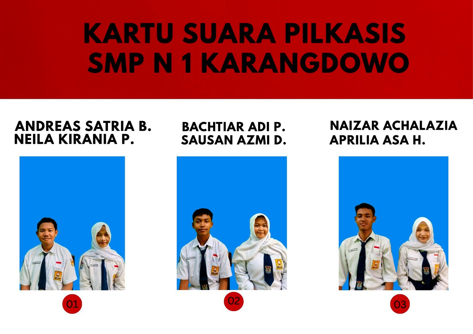 Kepala Sekolah SMP Negeri 1 Karangdowo, Sugeng Sihono, S.Pd., M.Pd., mengapresiasi pelaksanaan Pilkasis yang berjalan tertib dan penuh semangat. Ia menilai kegiatan ini dapat menumbuhkan nilai-nilai keadilan, persamaan, dan tanggung jawab di kalangan pelajar, sekaligus menjadi pembelajaran kepemimpinan yang konkret.